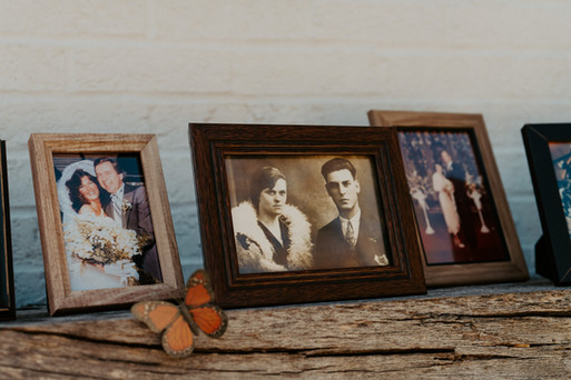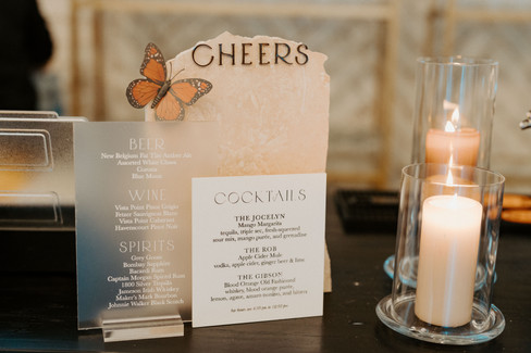 spray paint. On a perfect fall day we arrived at The Bradford, butterflies in tow. I went to check in with Chelsy, the planner, when I see her walking across the courtyard with a giant tulle bow in each hand. "Look at these!" she exclaimed. She said they were for the welcome sign and the seating chart. Sometimes the greatest design happens on the spot. We set-up the welcome sign and seating chart and added the butterflies after the bows and florals by Seeded Events and Design were in place. We set out bar signs, photo sharing QR codes, menus, and table numbers. Then we took our extra butterflies and added them around the venue; on bathroom mirrors, on cocktail tables, and on the fireplace mantle, which housed family photos of the bride and grooms loved ones. Everything was expertly captured by Howard Photo + Film. It was a day of beauty and whimsy and won't soon be forgotten.